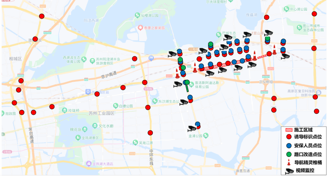 同时在相关交通节点设置指引标志和视频监控,并联合高德、百度导航平台进行周边路网诱导分流,在施工区域隔离设施上设置高德精灵导航预警提示,提升施工工地智能化管理水平。